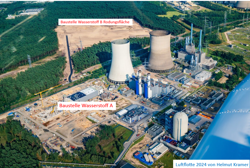 Zwischen diesen beiden Fotos liegen zwei Jahre: Oben ist die Fläche unterhalb der beiden Kühltürme noch nicht bebaut, unten entstehen die Gebäude für die Wasserstoff-Gewinnung.