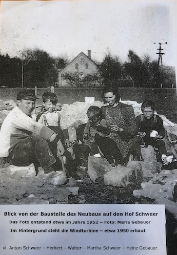 Das Foto zeigt im Hintergrund die Hofstelle mit der alten Windturbine. Auf der Baustelle sitzen: vl. Vater Anton Schweer, die Söhne Herbert und Walter, Mutter Martha Schweer und Cousin Heinz Gebauer.