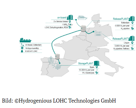 Der grüne Wasserstoff kann so auf dem Seeweg zunächst nach Rotterdam gebracht und per Binnenschiff nach Lingen transportiert werden. Am Standort der BP Raffinerie in Lingen soll der Wasserstoff dann bedarfsgerecht freigesetzt werden – und für die Industrie vor Ort nutzbar gemacht oder in das lokale Wasserstoff-Pipelinenetz eingespeist werden. Geplant ist zunächst die Speicherung und der Transport von bis zu 3.000 Tonnen Wasserstoff pro Jahr mittels LOHC.