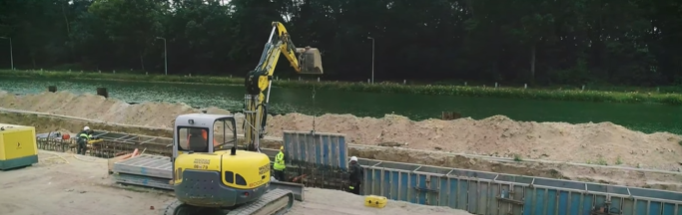 Man beginnt mit einem besonderen Bagger die Randfundamente auszuheben und vorgefertigte Stützelemente auszubaggern und dann ein Eisen Stahlgitter einzufügen. Dann kann eine bis zu 30 m tiefe außen Stahlwand für das spätere Schleusenbecken entstehen.