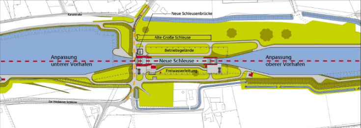 Die bisher zehn Meter breite Schleuse wird durch Neubau auf eine zwölfeinhalb Meter Breite und 140 Meter lange Schleuse ersetzt.