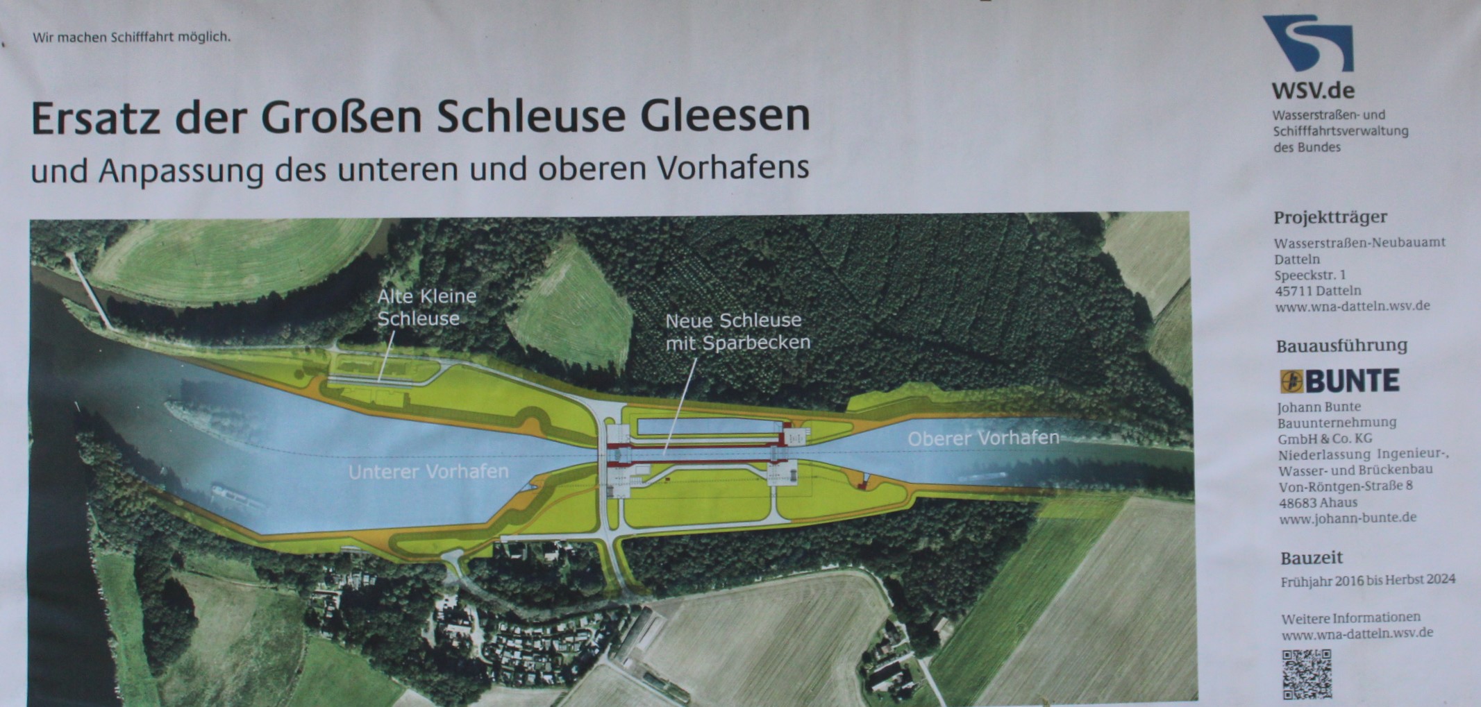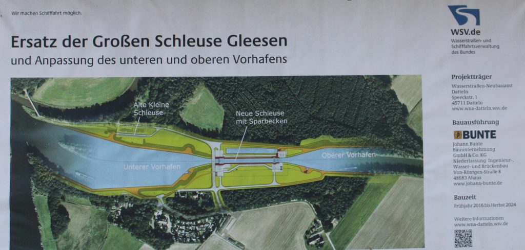 Die Nordstrecke des Dortmund-Ems-Kanals von Bergeshövede bei Rheine bis Papenburg soll für eine Befahrbarkeit für Europaschiffe und Großmotorgüterschiffe ausgebaut werden, so auch die Schleuse Gleesen.