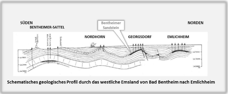 Das schematische geologische Profil zeigt die Abfolge d er ölführenden Form ationen von Bentheim im Süden (mit den Bentheim –Bohrungen im Zechstein) bis Emlichheim im Norden (mit den Unterkreide-Erdölfeldern Georgsdorf und Emlichheim).