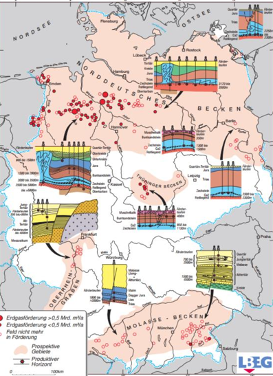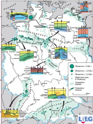 Prospektive Gebiete und charakteristische Strukturen und Formationen der Erdöl- und Erdgas Felder in Deutschland