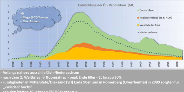 In der Region Emsland wurden über 100 Millionen Tonnen des „schwarzen Goldes“ bisher in einem Zeitraum von mehr als 80 Jahren aus den Feldern gefördert (ca. 1/3 der gesamtdeutschen Erdölproduktion; auch die großen niederländischen Ölfelder Schoonebeek und Nieuw-Schoonebeek sind Analoge der benachbarten deutschen Erdölfelder der Region).