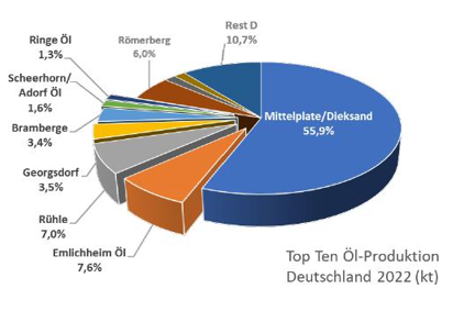 Im Jahr 2022 produzierten 43 Erdölfelder aus 683 Bohrungen in Deutschland 1,7 Mio.t Erdöl und trugen so zu knapp 2% zur Deckung des Verbrauchs von Erdöl in Höhe von 97,1 Mio.t bei (s. auch S. 9). Das mit Abstand größte deutsche Erdölfeld ist Mittelplate/Dieksand im Wattenmeer südwestlich von Büsum. In dieser Feldesgruppe werden aus den geologischen Schichten des Dogger (Mittlerer Jura*) zurzeit knapp 56% der deutschen Erdöl-Jahresproduktion gefördert.