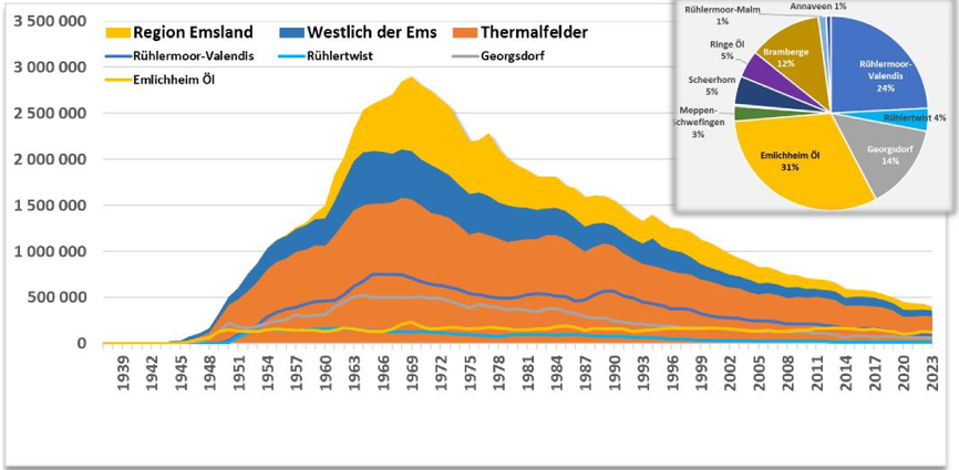 Beginn der tertiären Förderung (Heißwasser- & Dampfinjektion) Mitte der 70er Jahre; aktuell tragen die Thermalfelder Rühle (mit Rühlertwist (4%), Rühlermoor-Valendis (24%), Georgsdorf (14%) und Emlichheim Öl (31%) insgesamt 74% der Förderung der Region.