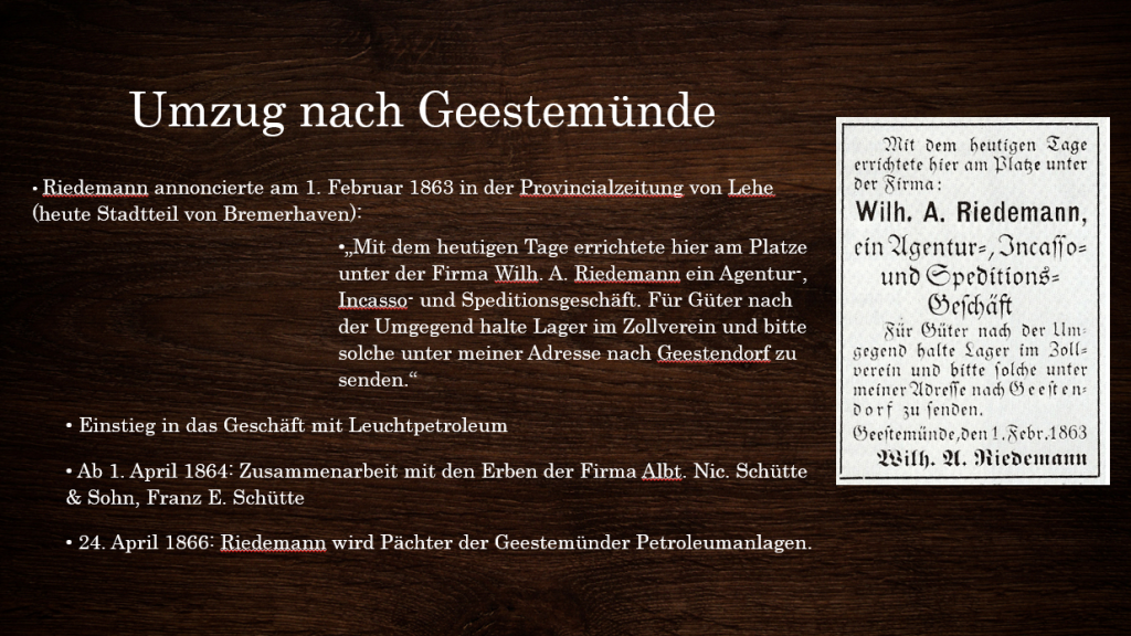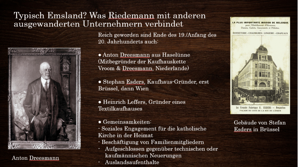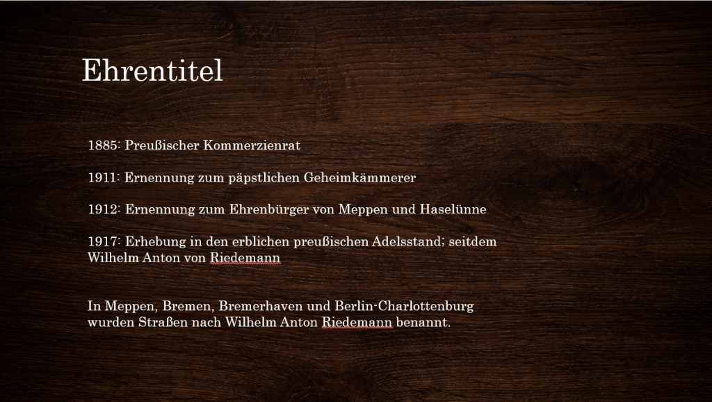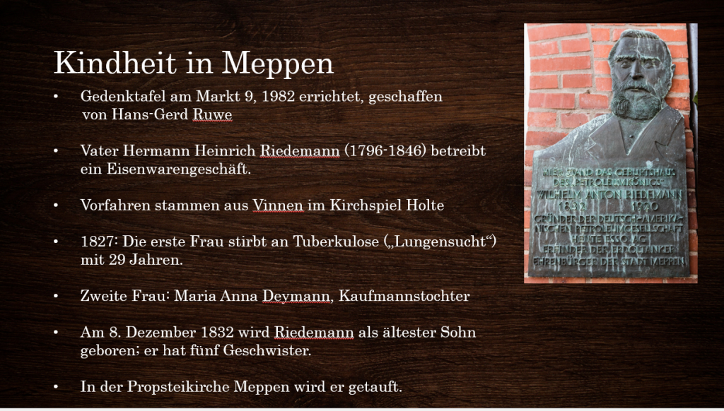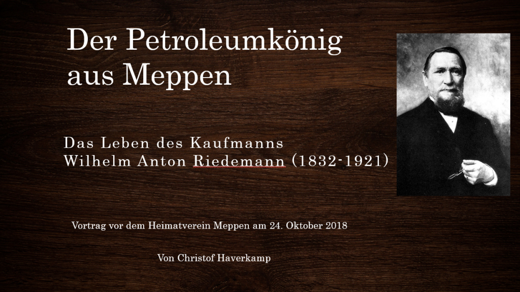 Wilhelm Anton Riedemann wurde 1832 in Meppen als Sohn eines Eisenwarenhändlers geboren. In seinen Jugendjahren wanderten seine Eltern nach Amerika aus. Nach dem Tod des Vaters durch eine ansteckende Krankheit kehrte die Familie nach Deutschland zurück. Wilhelm Anton wurde Kaufmann und zog nach Geestemünde (heute Bremerhaven)und begann den Handel mit Petroleum. Durch Kooperation mit anderen Ölkaufleuten gründete er eine eigene Reederei. Im Jahre 1855 ließ er den ersten Öltanker der Welt in England bauen. Dadurch verbilligte sich das Petroleum im Vergleich zum Transport in Holzfässern um die Hälfte. Er verlegte daraufhin seine Geschäfte nach Hamburg und beteiligte sich dort am Ausbau des Petroleumhafens. Im Jahre 1890 gründete er unter anderen zusammen mit dem amerikanischen Erfolgsunternehmer John D. Rockefeller die Deutsch-Amerikanische Petroleum Gesellschaft, aus der später die heute noch bekannte Weltfirma Esso entstand. Auch in der erfolgreichen Zeit in Hamburg blieb Riedemann seine Heimat treu. Er heiratete die Emsländerin Sophie Bödiker aus Haselünne. Als überzeugter Katholik spendete er unter anderem Kircheneinrichtungen in Meppen und Haselünne. In den Jahren vor dem Ersten Weltkrieg besaßen die Firmen, an denen er beteiligt war, die größte Tankerflotte der Welt.