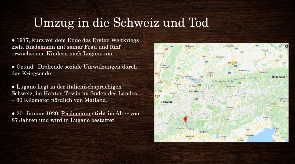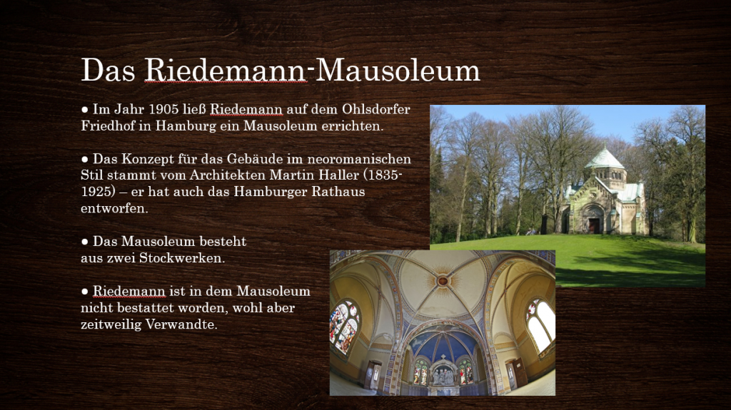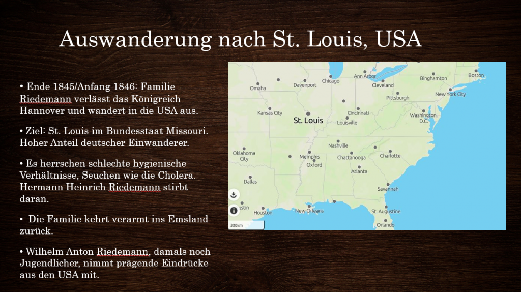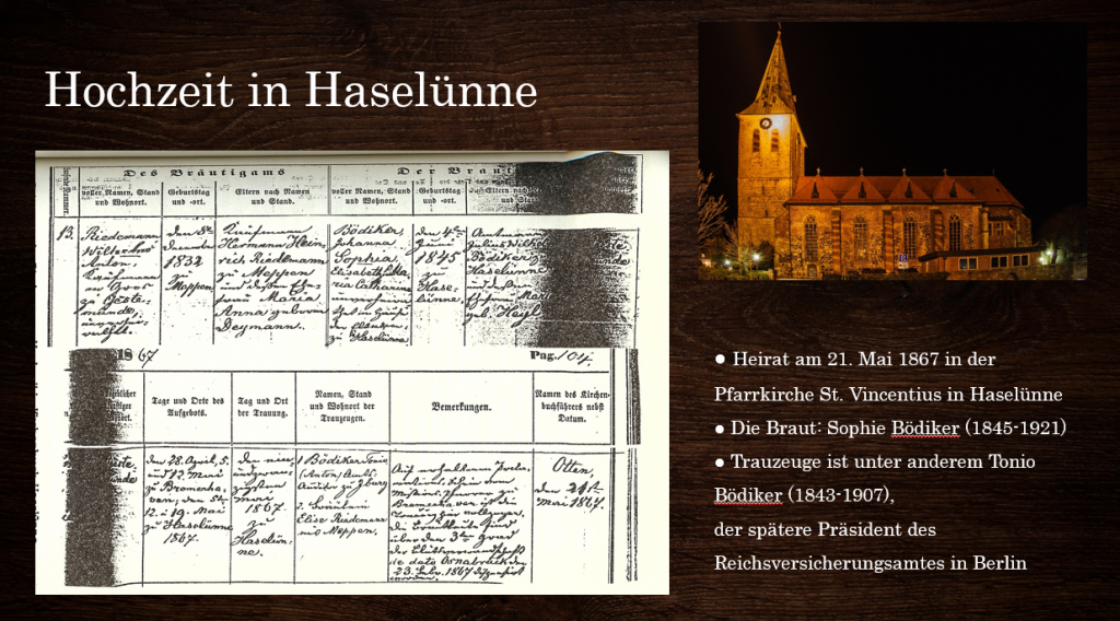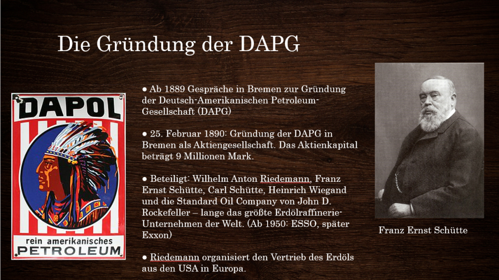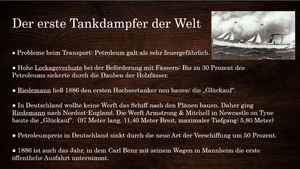 Wilhelm Anton Riedemann wurde 1832 in Meppen als Sohn eines Eisenwarenhändlers geboren. In seinen Jugendjahren wanderten seine Eltern nach Amerika aus. Nach dem Tod des Vaters durch eine ansteckende Krankheit kehrte die Familie nach Deutschland zurück. Wilhelm Anton wurde Kaufmann und zog nach Geestemünde (heute Bremerhaven)und begann den Handel mit Petroleum. Durch Kooperation mit anderen Ölkaufleuten gründete er eine eigene Reederei. Im Jahre 1855 ließ er den ersten Öltanker der Welt in England bauen. Dadurch verbilligte sich das Petroleum im Vergleich zum Transport in Holzfässern um die Hälfte. Er verlegte daraufhin seine Geschäfte nach Hamburg und beteiligte sich dort am Ausbau des Petroleumhafens. Im Jahre 1890 gründete er unter anderen zusammen mit dem amerikanischen Erfolgsunternehmer John D. Rockefeller die Deutsch-Amerikanische Petroleum Gesellschaft, aus der später die heute noch bekannte Weltfirma Esso entstand. Auch in der erfolgreichen Zeit in Hamburg blieb Riedemann seine Heimat treu. Er heiratete die Emsländerin Sophie Bödiker aus Haselünne. Als überzeugter Katholik spendete er unter anderem Kircheneinrichtungen in Meppen und Haselünne. In den Jahren vor dem Ersten Weltkrieg besaßen die Firmen, an denen er beteiligt war, die größte Tankerflotte der Welt.