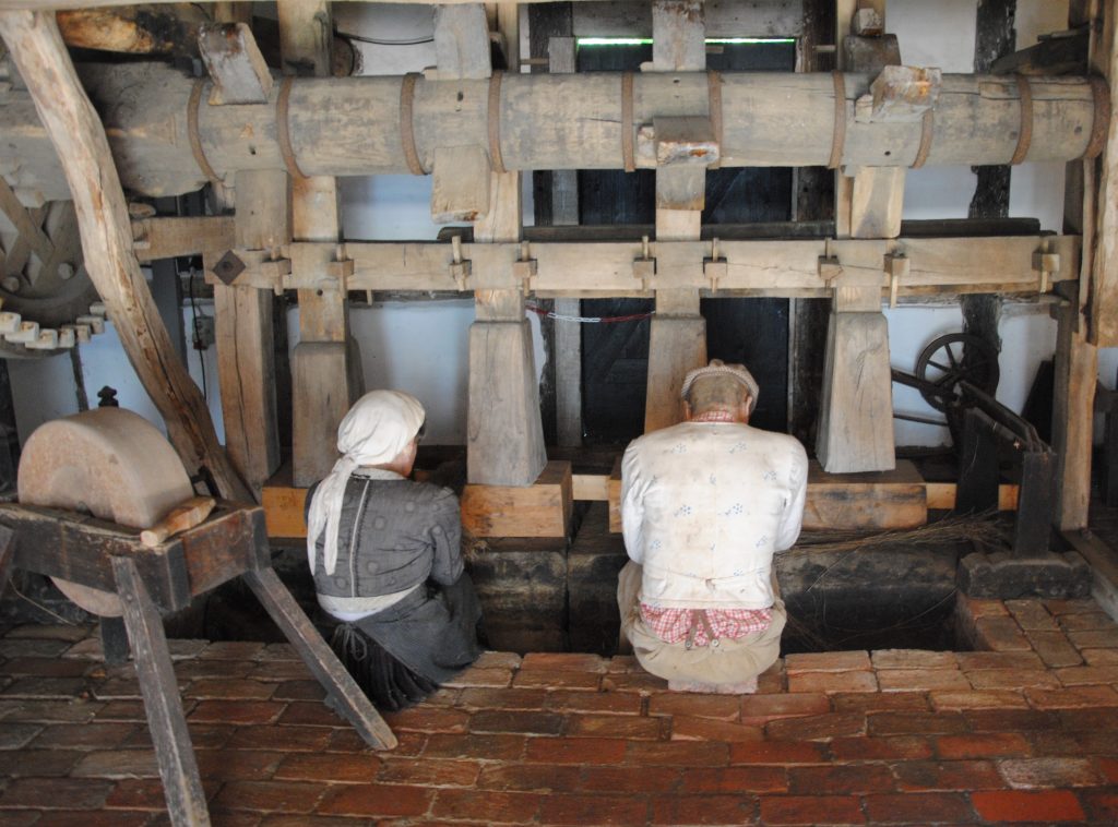 Hier wird der Flachs maschinell gebrochen. Der Antrieb geschah durch einen Pferdegöpel draußen.
