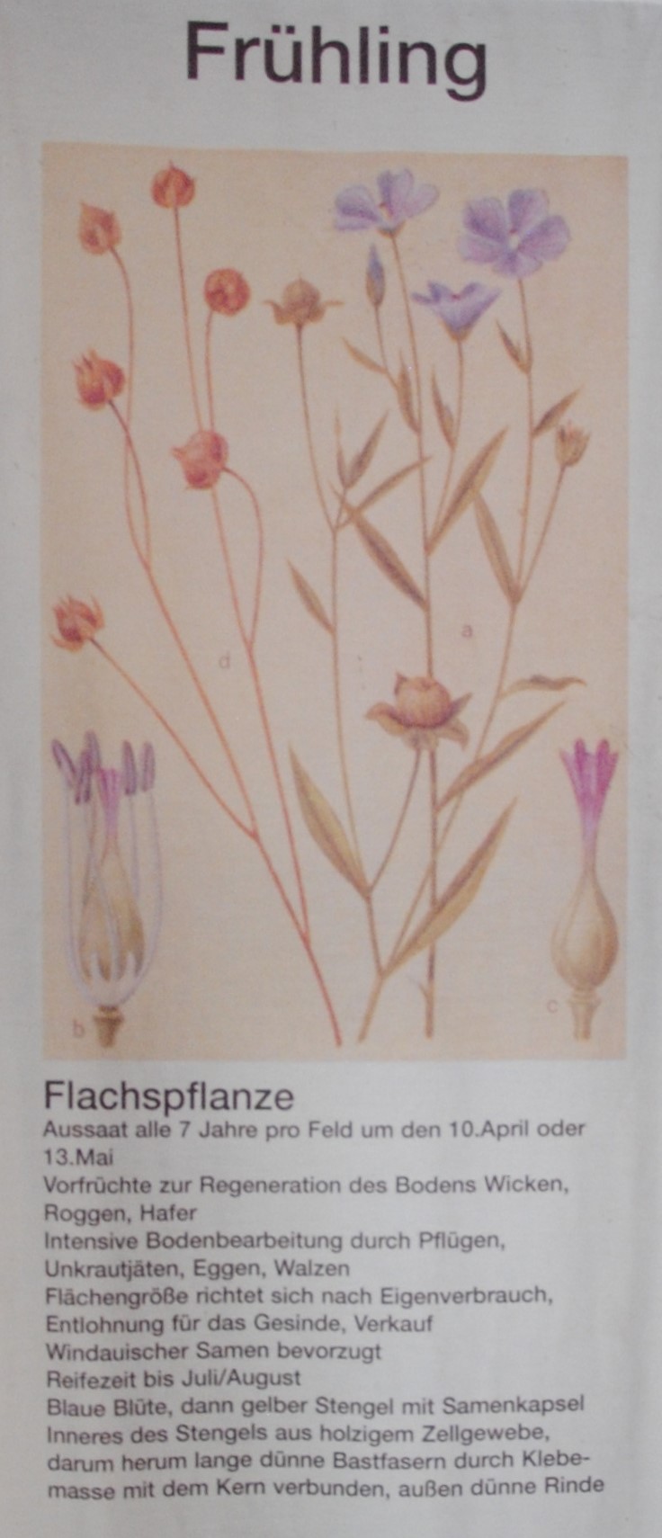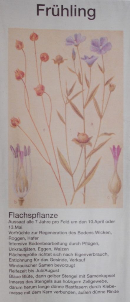 Etwa ab dem 100. Tag im Jahr wurde der Flachs auf dem Feld ausgesät, also etwa um den 10. April herum.