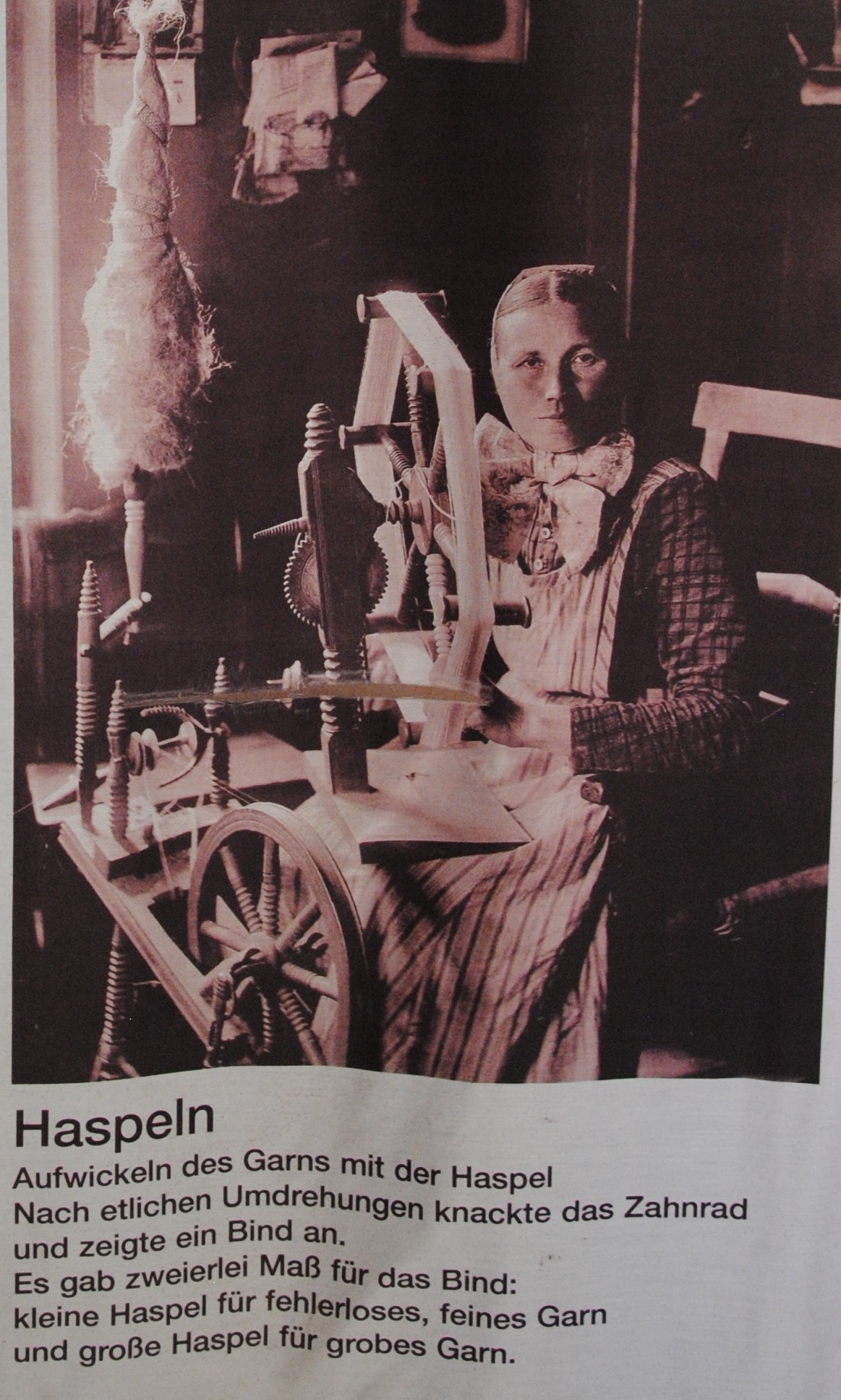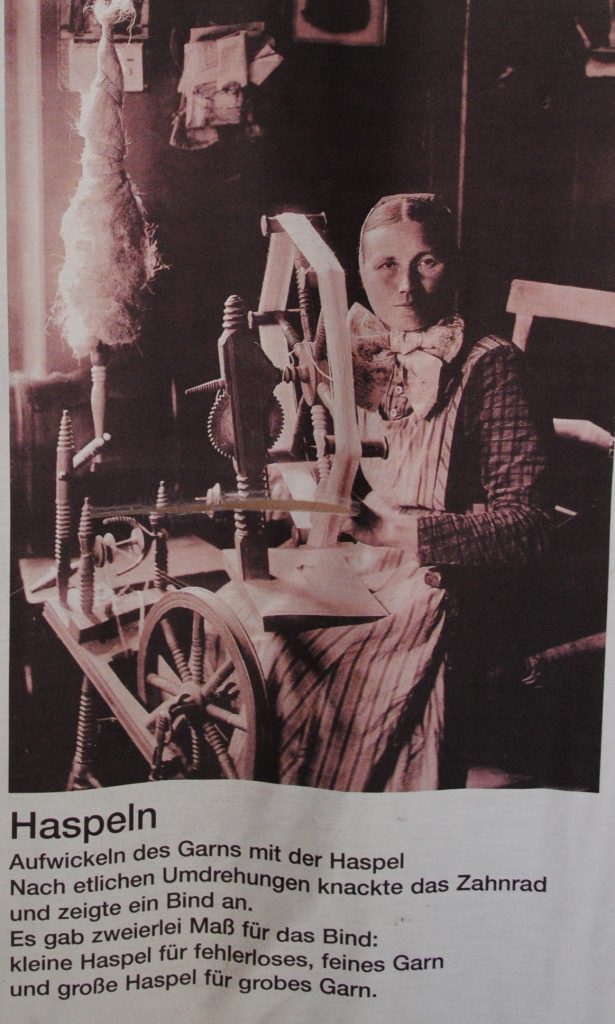 So erhielt man den Flachs in einer reinen Form, so dass er mit Hilfe der Spinnrades zu einem endlosen Faden gesponnen werden konnte. Anschließend wurde dieser Faden auf einer Haspel aufgedreht. Dieses Gerät war genormt, damit man das Garn nach vergleichbaren Größen verkaufen konnte. So waren 50 Umdrehungen ein Bint, 50 Bint ein Stück.