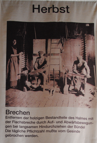 Der erste mechanische Arbeitsgang zur Gewinnung der Leinenfaser war die Behandlung in der Flachsbreche.