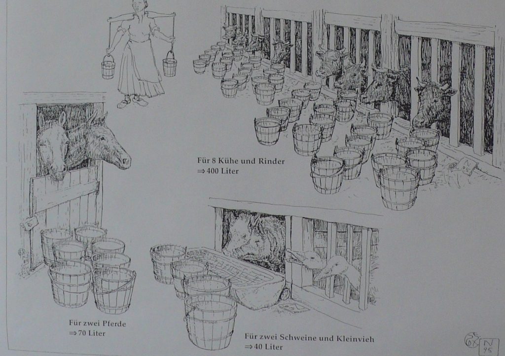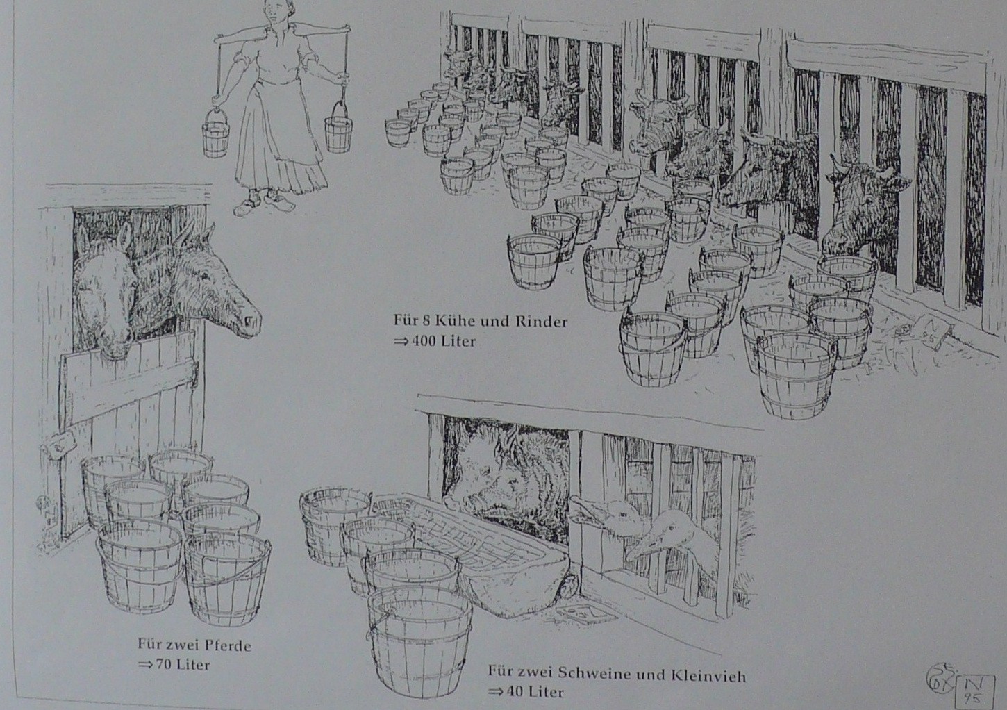 An Waschtagen und beim Schlachten sowie zu dem wöchentlichen Badetag summierte sich die Menge der benötigten Wassers leicht auf über 1000 l, das waren dann etwa 100 Eimer Wasser, die von draußen ins Haus herangeschleppt werden mussten.