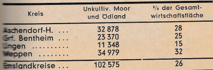 „Trotz aller Bestrebungen, das Kulturland zu verbessern und zu erweitern und Moor und Ödland in landwirtschaftliche Nutzflächen umzuwandeln, sind heute immer noch im hannoverschen Emsland 102.575 ha Moor und Ödland, gleich 26 % der Gesamtwirtschafttsfläche (das ist landwirtschaftliche Nutzfläche, Waldfläche, Moor und Ödland, Gewässer, Gebäude und Hofflächen) vorhanden. Diese verteilen sich auf die Kreise folgendermaßen: