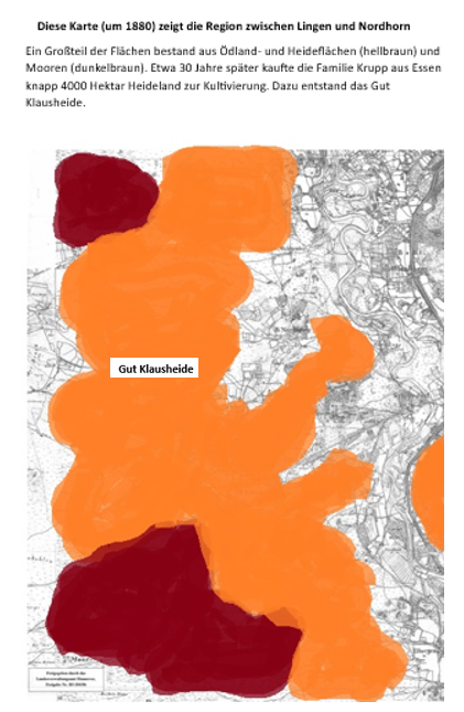 Um das Jahr 1910 hatte Bertha Krupp von Bohlen und Halbach einen Makler aus Königsberg damit beauftragt, im deutschen Reichsgebiet eine möglichst große Heidefläche zwecks Gründung eines landwirtschaftlichen Gutsbetriebes ausfindig zu machen. Nach vergeblichen Versuchen im Raum Hamburg und in der Lüneburger Heide wurde der Grundstücksfachmann im südlichen Emsland und der Grafschaft Bentheim zwischen den Städten Nordhorn und Lingen fündig.