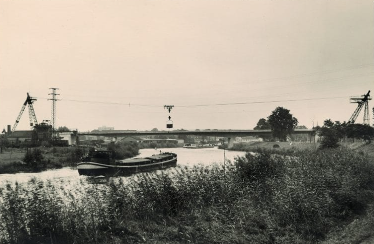 Im Winter 1921 wurde in Meppen ein sogenannter Kabelkran über die Ems gespannt. Dieser stellte die Anbindung des Heseper Torfwerks an den Emshafen Meppen sicher, für das Unternehmen damals sozusagen das Tor zur Welt.
