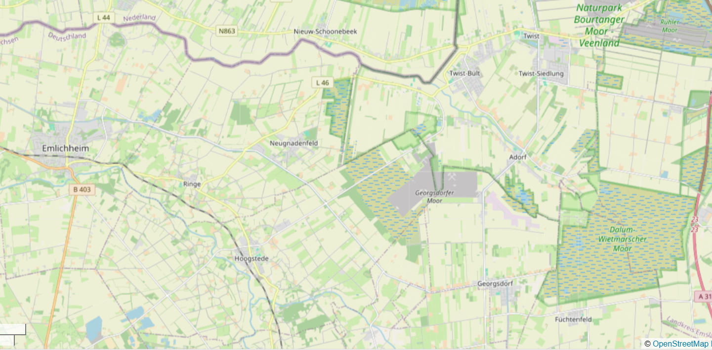 Diese Karte aus Open Street Map zeigt die Lage von Neugnadenfeld (ehemals Alexisdorf) östlich von Emlichheim.