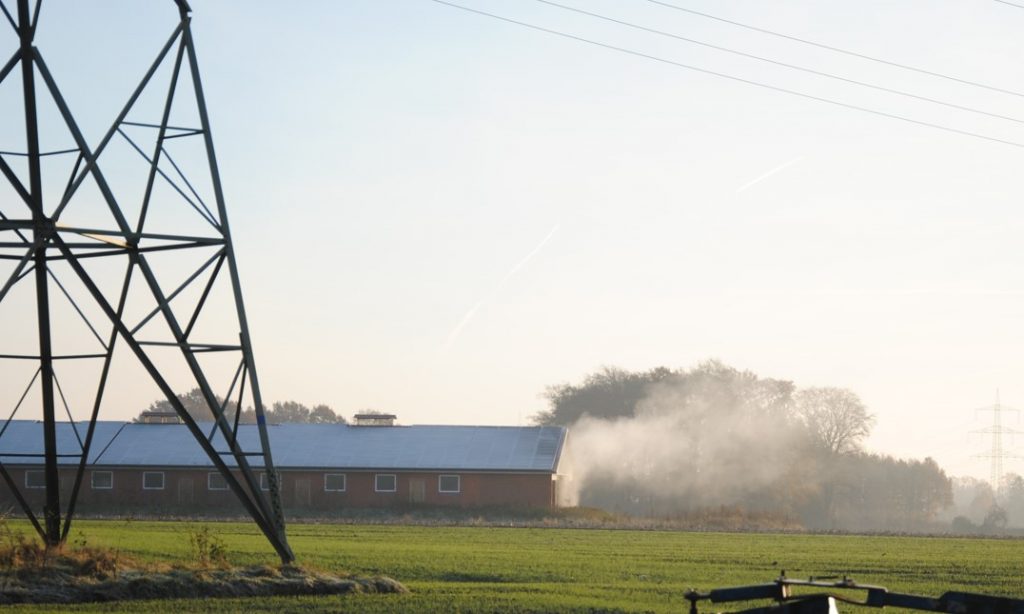 Ein besonderes Foto ist hier gelungen: Die Übergangswetterlage lässt die Verdunstungswärme der Mastschweine deutlich werden. Mittlerweile sind in vielen Ställen Wärmetauscher aufgestellt, die diese „kostenlosen“ Energiequellen nutzen.