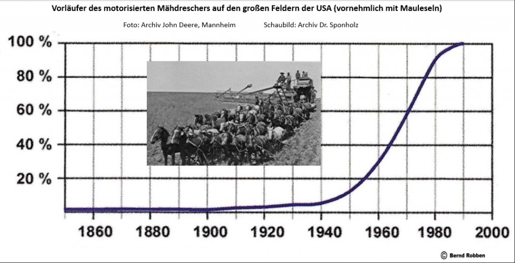 Es ist heute wohl kaum noch vorstellbar, etwa 40 Pferde – oder auch Maulesel – vor einer ratternden Maschine anzuspannen.