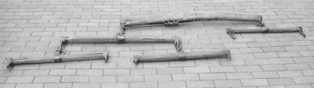Die obigen Anspannvorrichtungen nennt man Schwengel – hier für ein Dreiergespann. So hatten die Arbeitstiere genügend Platz nebeneinander. Auch ihre unterschiedliche Arbeitsleistung konnte durch das unterschiedliche Einhängen in den drei Ösen am oberen Schwengel eingestellt werden.