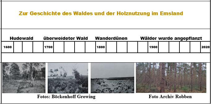 Der Beginn des Raubbaues am Wald lag aber schon weit vor unserer Zeit. Nach 1400 hatte die Waldvernichtung einen ersten Höhepunkt erreicht, und im weiteren Verlauf verwandelte sich das Emsland von einem einst reich bewaldeten Land in eine fast baumlose Gegend. „Der“ Wald war bis auf eine paar spärliche Reste nicht mehr da. Dort, wo es einmal Wald gegeben hatte, war auch der Mensch gewesen, und dort, wo der Mensch gewesen war, gab es nur noch Heide.