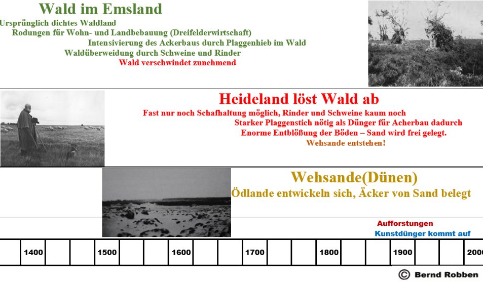 Mit dem weitgehenden Verschwinden des Waldes war aber der Prozess der Vernichtung der Vegetation im Emsland noch nicht beendet, denn die zunehmende Entwaldung und die darauf folgende Verheidung der Landschaft veränderten zwangsläufig die Art und Weise der Landwirtschaft. Jetzt wurden die Heideflächen vom Menschen ausgebeutet. Gegen Ende des 17. Jahrhunderts gab es kaum noch Eichenwälder, die für die Schweinehaltung und –mast notwendig gewesen wären, so dass immer mehr Schafe gehalten wurden, die in ihrer übergroßen Zahl mit ihren scharfkantigen Klauen an vielen Stellen die Heide so zertraten, dass sie nicht mehr nachwachsen konnte.