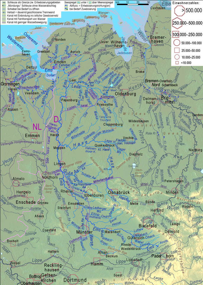 Die Ems, die dieser Region ihren Namen gibt, bietet bei einer Fallhöhe von etwa 30 Metern (Salzbergen im Süden mit 34 m über NN bis Papenburg im Norden mit 2 m NN an seinen Wehranlagen in